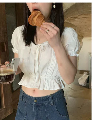 Vintage Lace Crop Chiffon Top with Tie Detail